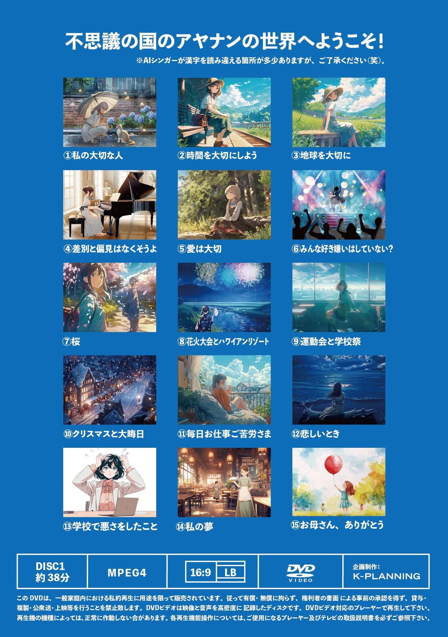 障がいのあるアーティスト・立花綾奈が書いた詩を元に、AIアプリで作曲。ミュージックビデオに加工し、YouTube動画として公開したものをまとめたDVDである。YouTubeに未公開の作品も全曲収録し、15曲が収められている。作者が紡ぎ出す「障がい当事者からの想い」「平和な世界を望む純粋な願い」に、多くの人は心を洗われるに違いない。シンブル過ぎるほどの詩にAIミュージシャンが作成したリズミカルな曲と組み合わせることにより、これだけ説得力あるメッセージに生まれ変わることを、ぜひとも体感してほしい。全曲の詩を掲載した歌詞リーフレット付き。